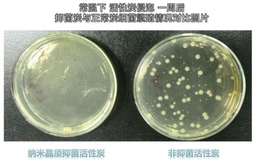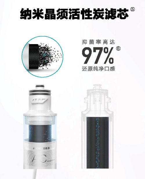 目前,大多数净水器都会安装活性炭滤芯,用以去除水中的有机物、余氯、异味等,使水得到净化。但活性炭拥有巨大的空间结构,只要温度适宜,细菌滋生难以避免。有研究数据表明,细菌在25度环境下,活性炭内一个细菌存放4天将变成4000个以上。而采用纳米晶须与椰壳炭颗粒按特定的比例均匀混合应用到净水系统,可以有效阻止细菌在活性炭中的生长,抗菌率高达97%以上。