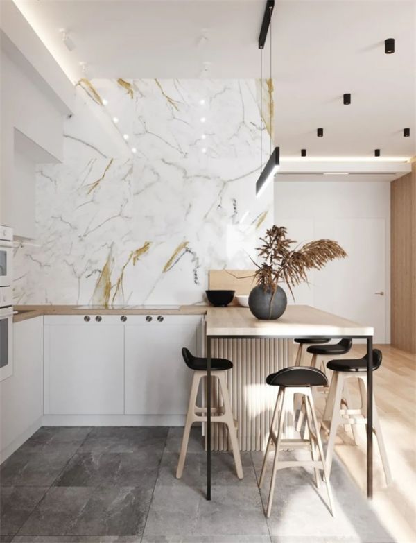 简洁时尚还显品味的轻奢家居,高冷的背景墙和大理石地面,辅以金属质感的家具细节,简约精致,给空间填充着时尚的气息。