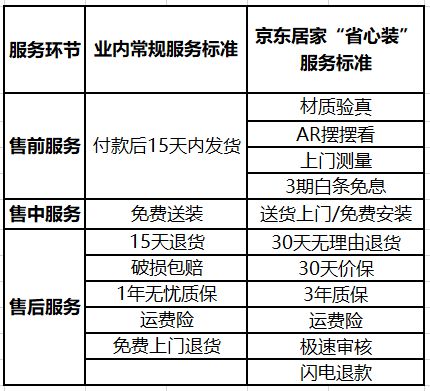 京东居家“省心装”服务包括AR摆摆看、上门测量、材质验真、3期白条免息、送货上门/免费安装、30天价保、30天无理由退货、3年质保、运费险、闪电退款、极速审核等11项贴心服务,完整贯穿售前、售中到售后,消费者只要认准京东居家“放心购·省心装”标识,即可获得安心无忧的全流程消费体验。