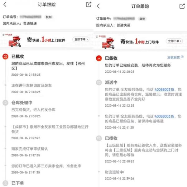 按照以往的网购家具模式,消费者下单后,只能看到付款时间、发货时间、成交时间,无法看到具体物流信息。现在通过京东居家服务平台,则可以全程可视化跟踪产品流向,对订单出库、拣货、分拣、送货、派单、收货、安装等信息一目了然,连配送员和安装师傅的姓名、电话、上门时间也一清二楚。