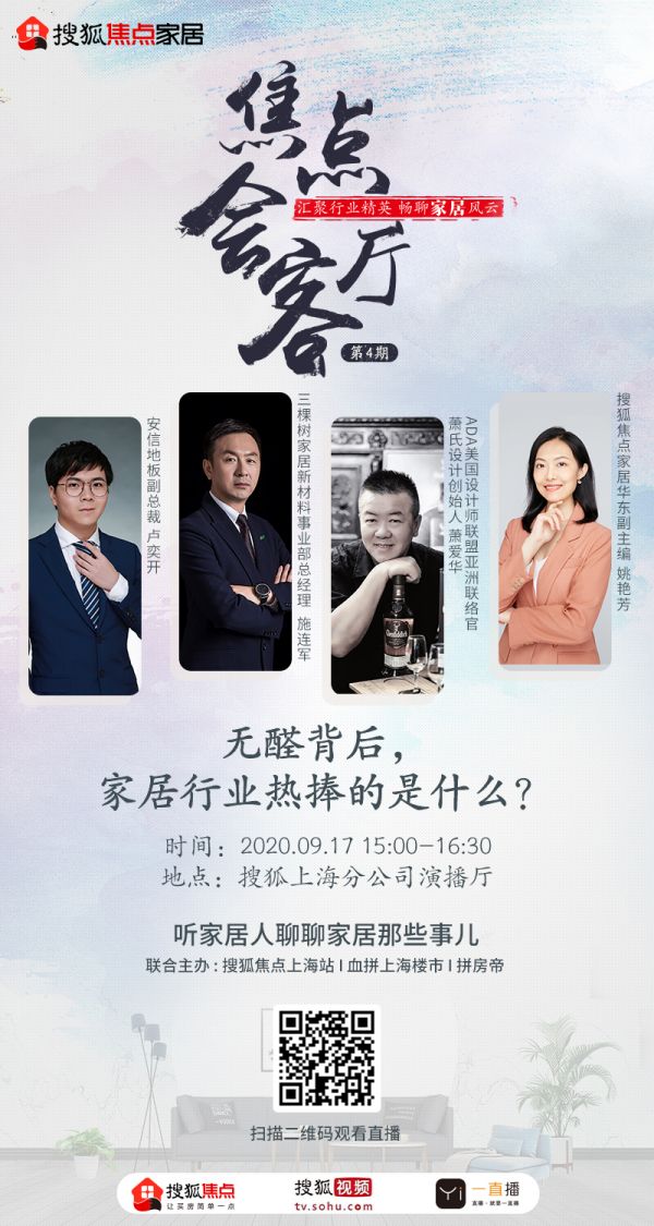 汇聚行业精英,畅聊家居风云!本期《焦点会客厅·家居》特别邀请到安信地板副总裁卢奕开、三棵树家居新材料事业部总经理施连军、ADA美国设计师联盟亚洲联络官、萧氏设计创始人萧爱华三位嘉宾,对话由搜狐焦点家居华东副主编姚艳芳主持。本期主题聚焦疫后期家居企业为何借“无醛”破局,与数位家居大咖共话“无醛”概念背后的产业升级战略,深度分析“无醛”角逐下的行业格局重洗,共同开启“无醛”新健康人居时代!