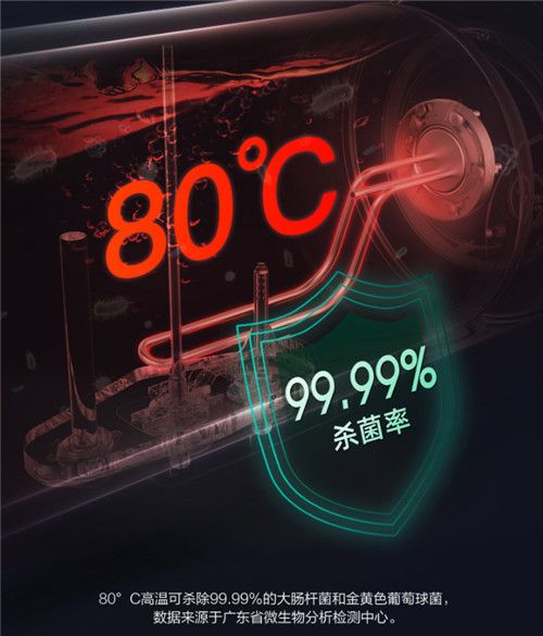 产品自带的80℃高温自洁功能,值得点赞。可利用加热管将内胆中的水加热到80℃,有效消灭水中99.99%的微生物细菌,告别脏水洗澡。