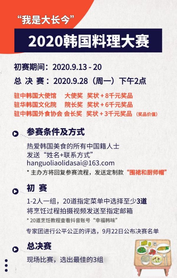 参赛方式只要将“姓名+联系方式+快递收货地址”发送到官方指定邮箱(hanguoliaolidasai@163.com)。主办方就会将参赛流程和参赛菜单发到你的邮箱内,你也会获得主办方定制的“围裙和厨师帽”。参赛可1-2人自有组成一组,从主办方指定的20道参赛菜品中选择任意3道,拍摄烹饪视频提交即可。(提交截止日期2020.9.20)总决赛将在2020年9月28日(周一),位于北京的驻华韩国文化院举行。总决赛当天评审团将以公平公正的评分标准选出3个获胜组,奖品也是非常丰厚。