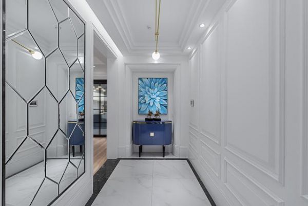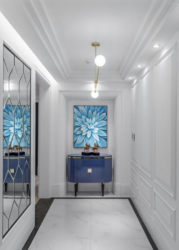 玄关的设计在满足美观的设计感的同时将其功能性发挥到极致,入户墙面的穿衣镜以及挂衣区的设计满足了需求的同时,与对面墙上的造型线形成呼应。