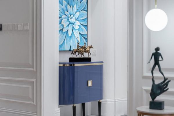 弧形造型墙的设计在满足设计美观的同时,使原始的下水管道得到遮挡。设计师借用原始墙体的错层设计了定制鞋柜,与整面造型墙形成整体。