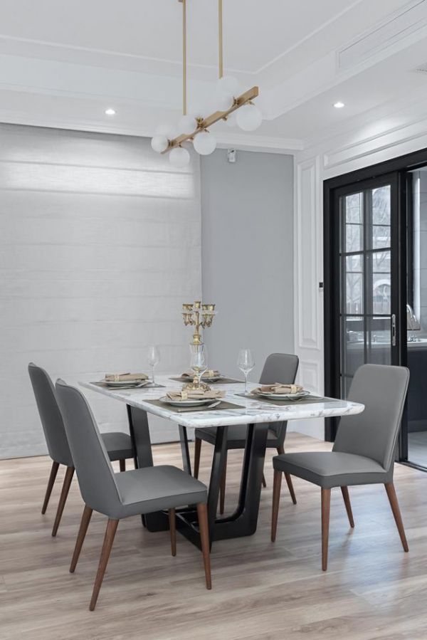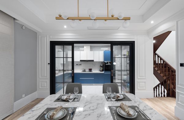 简约的石膏线条来凸显整个空间的层次感,客餐厅并没有做刻意的分割,顶面与地面统一一体化设计,色调尽可能保留白色基调,来弥补原始户型采光并不充足的缺陷。罗马帘的设计在使用上也得到很大的便利性。