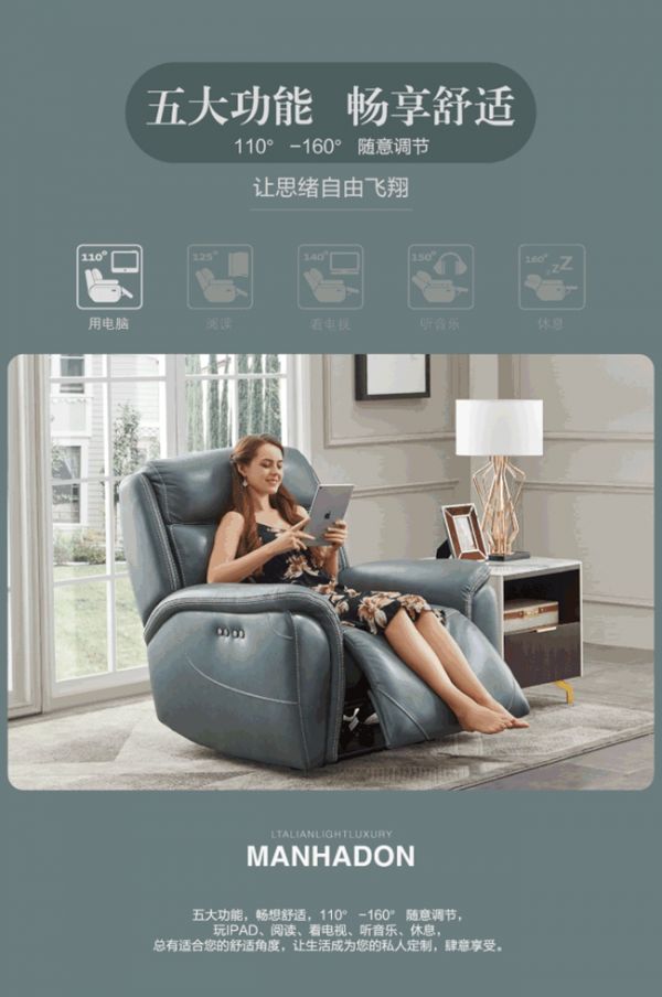 产品采用双电机超凡配备,头部亦可单独精细调节。丰富储物配置配以USB快捷充电,带来尊享奢华的舒心享受。无论是高贵大气的外观、贴心的人体工学设计,还是智能化的功能,芝华仕90011罗斯福单品都展现出了一款高端沙发应有的奢华品质。