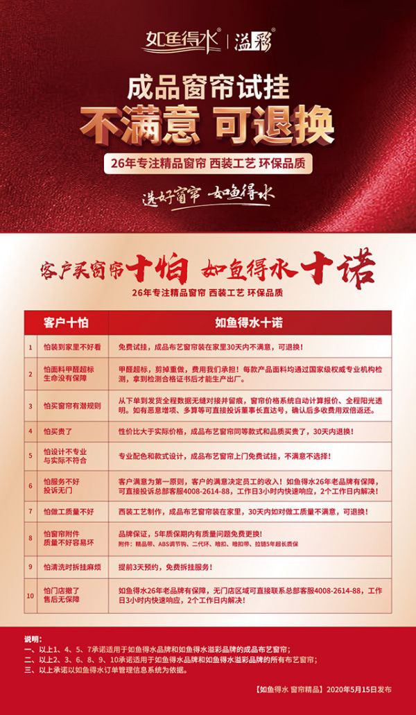 2020年5月15日,如鱼得水携手30位管理层郑重发布“客户买窗帘十怕,如鱼得水十诺”,立刻受到了客户的一致好评。不难看出,新的服务政策下,产品退换风险被全部转移至厂家,不仅省去售后担忧,还极大减少了经销商压力,同时也让产品、经销商和品牌在市场上更具竞争力。销售成本就是人心成本,得民心者才能占据市场主导地位。经销商们纷纷表示,成品窗帘试挂给了经销商更大的底气,更加真诚的去服务每一位客户,前来咨询购买的客户也更多了,消费者也实实在得到了福利。