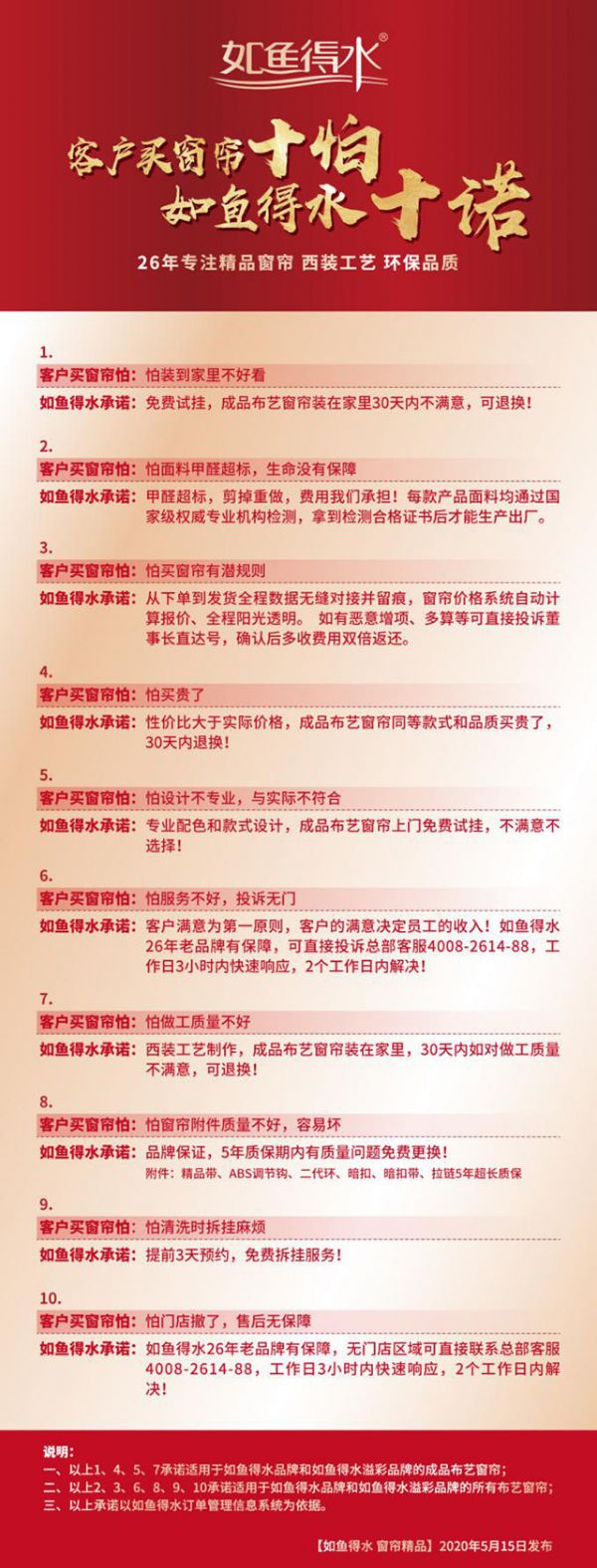 自成立以来,如鱼得水始终坚持着“以人为本”的原则,并时刻关注消费者的生活状态和实际需求。针对消费者购买窗帘时可能存在的顾虑,如鱼得水不仅在行业内率先推出成品窗帘试挂,不满意可退换服务,还郑重发布“十大承诺”,希望通过专业贴心的服务来打消客户隐忧,从而帮助更多消费者了解如鱼得水窗帘,爱上如鱼得水窗帘。“十怕十诺”的推出,背后反映出如鱼得水长期以来对市场的观察,对消费者需求的深刻理解与感悟。这些贴心而又针对性的服务政策,也无形之中增强了客户粘性,无怪乎如鱼得水多年来始终都保持着极佳的口碑了。