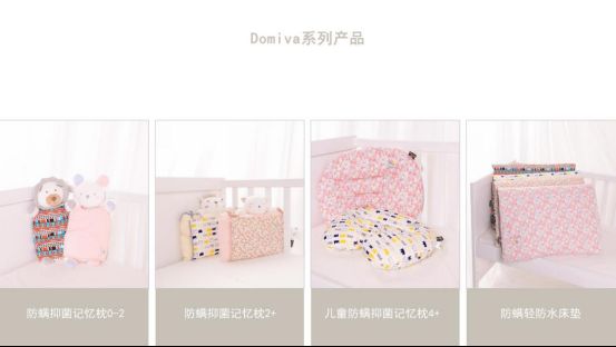 DOMIVA旗下有防螨定型枕、2-4岁防螨记忆枕、4-6岁防螨记忆枕以及婴幼儿防螨床垫,产品多样化、多态化,且均通过了国际环保纺织协会严格的 Oeko-Tex Standard 100 测试和认证及欧洲ECARF五星防护大奖。