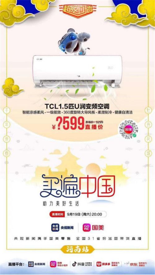 9月19日本周六20:00,通过央视新闻、国美、抖音、京东多平台均可同步观看直播,质优价美好空调等你带回家!