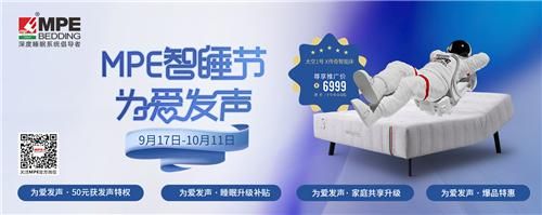 9月17日-10月11日,“MPE智睡节·为爱发声”全国门店联动大促来袭,这是一场钜惠联动,也是一次爱的发声,全民升级智能床,用诚意为爱助力!