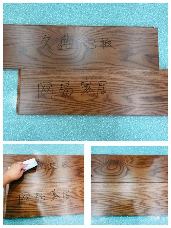 除了耐磨性能之外,地板漆面的抗污性能同样十分重要。从图片中我们可以看到,黑色马克笔在地板表面上写下的字迹能够很轻松地擦除,可见这款地板具有出色的抗污能力,便于日常清洁。对于追求轻松、舒适生活的消费者和有小孩的家庭来说,这样的产品非常有诱惑力。