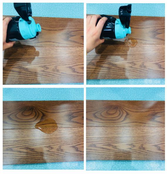 实木地板重要评价标准之一就是防水性能,在日常生活中经常能发生地板接触水的情况。现在我们来看看这款地板的防水能力如何,将水倒在地板的夹缝处,水遇地板便凝结成了水珠,静置15分钟后,观察地板表面,水珠未散,也没有出现明显的渗水现象。可见地板的防水性能优良,可以避免地板因受潮而导致的一系列问题。