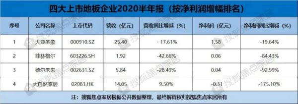在已经公布的2020年半年报中,大亚圣象、大自然家居、德尔未来、菲林格尔四家上市地板企业上半年业绩不理想。大自然家居的利润下滑最严重,年报显示,截至2020年6月30日止,大自然家居六个月内权益持有人亏损3054.5万元,去年同期股东溢利为4067.7万元,降幅高达175.1%;从营业收入上看,大自然家居上半年实现营收14.05亿元,同比增长9.5%,也是唯一实现营收正增长的地板企业。
