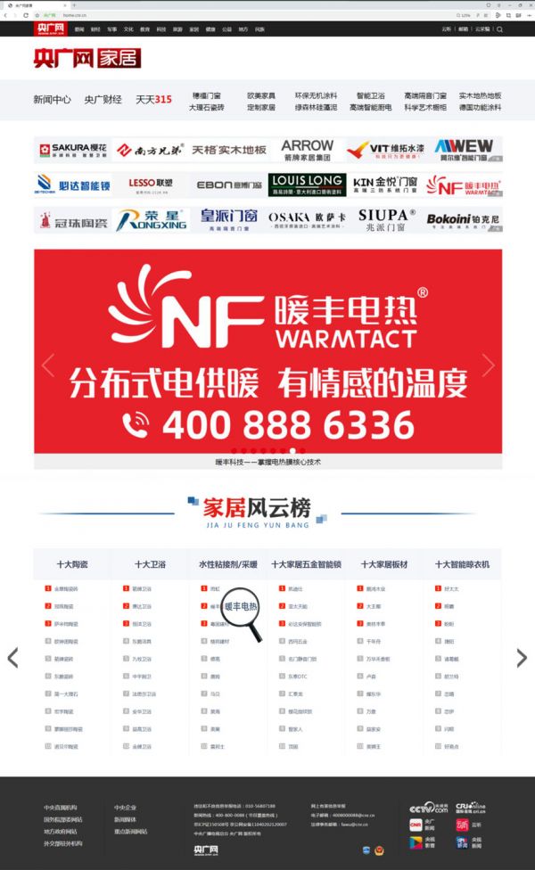 央广网(www.cnr.cn)是由中国国家广播电视总台-中央人民广播电台主办的中国最大的音频广播新闻网站。是中央重点新闻网站和中国最具影响力的网络媒体之一!国家媒体的公信力和引导力为品牌提供强大的背书,国家平台成就中国大家居品牌。借助国家新闻网站央广网将中国暖丰电热“分布式电供暖,有情感的温度”传向世界,同时暖丰电热也凭借“细分行业龙头企业”荣登央广网的首页,在央广网“家居风云榜”排名前列。