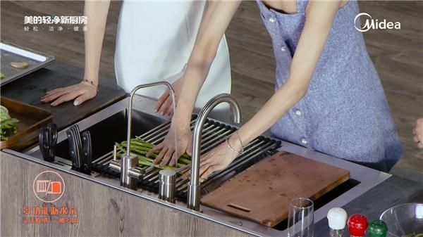 旧厨房橱柜台面杂乱,厨房拥挤,水槽设计单一,让餐前备菜成为了繁琐的工序。美的轻净新厨房基于这一洞察,解决餐前备菜繁琐,优化动线布局,把功能和空间布局融合为一,推出集成式水槽洗碗机——悦净,多功能水槽、中式灭菌洗碗机、净水器、垃圾处理器选配组合,帮你搞定餐前餐后清清洁难题,,实现“备菜更轻松”、“清洁星标准”、“厨余无残留”的厨房洁净标准。