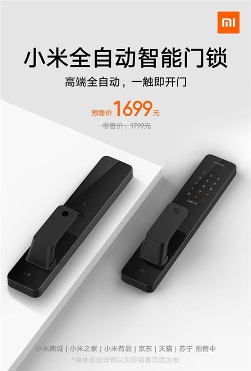 9月22日,小米全自动智能锁在小米商城/小米之家/小米有品/京东/天猫/苏宁 等平台开启预售,预售期间100元定金抵200元,到手价为1699元。据了解,这是小米推出的首款全自动智能门锁,采用疾速全自动锁体和直插式C级锁芯,搭载10重安全防护,实现“开锁即开门,又快又省心。”
