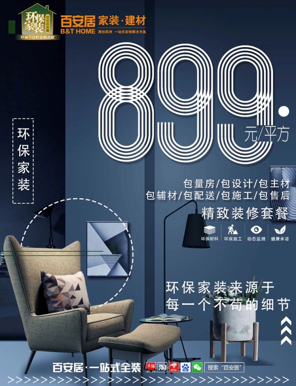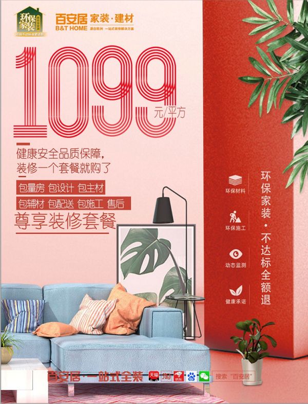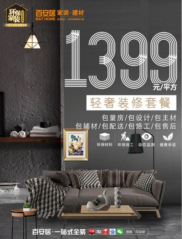 聚焦时代的发展,缔造消费者所需的家装精品。专注于家装建材行业21载的百安居勇于革新,全新推出3大主题装修套餐,从设计、配置、环保、品牌4个方面全新升级,实现12种设计风格可随意选择切换。升级后的套餐在家装中的五大空间配置,实现八项全包,七项不限的无忧式一站家装。三大套餐皆采用环保材料、环保施工、动态监测,并且健康承诺:环保不达标全额退款!套餐内家装项目全包含,多种风格任意选,套餐内产品丰富,可任意组合,从根源上保障环保家装、品质家装、无忧家装。