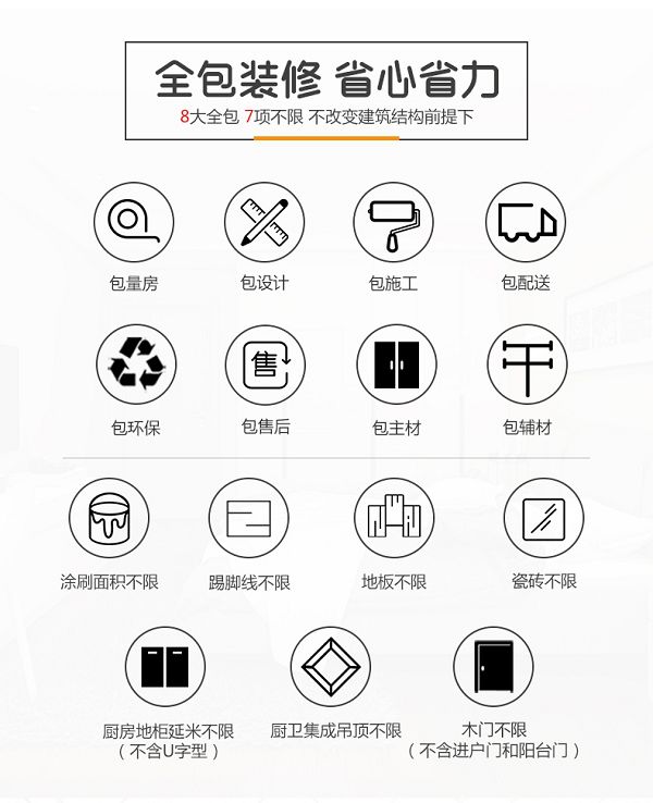 安心居家生活,源于更标准的施工。套餐升级后实现全包装修、省心省力。以8大全包、7项不限,从根本上避免了施工增项的出现。施工工艺涵盖客厅、卧室、厨房、卫生间、阳台5大空间标准化施工,全线商品可自由升级和置换,上万款商品任意挑选搭配,百安居升级装修套餐满足家装配置所有需求!施工工艺升级,质量严格把控,9大净享环保工艺贯穿全线装修工程,保障品质家装,延长使用寿命。
