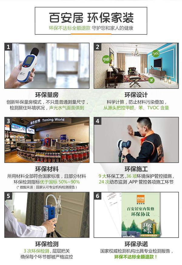 百安居从产品、服务、管理及售后等各个方面确保环保装修,确保消费者净享环保家装。装修采用环保量房、环保设计、环保材料、环保施工、环保检测、环保承诺6大举措,并通过声、光、水、气、湿五个方面检测全屋状态;科学计算,从源头把控甲醛、苯、TVOC含量;使用环保材料,采用9大环保工艺、36项环保管控, 3次专业环保检测出具专业检测报告,力求家装安心舒适,守护您和您家人的健康。