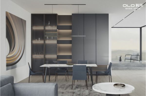 当从这样的厨房走出迈入餐厅,我乐家居优秀的原创设计团队打造出雾面质感的“莫兰迪“柜门,与通透坚实的玻璃高柜交相呼应,沉稳厚重的灰调空间和暖色调的灯光系统,不同材质、不同色块却碰撞糅合出刚柔并济的审美感受,让现代的饮食空间便捷亦不失美丽。