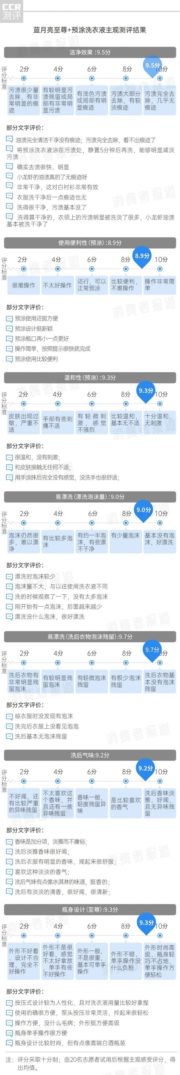 此外,收集分析了2.3万余条天猫、京东电商平台该品牌官方渠道的评论数据,得出消费者使用这款洗衣液后的评价结果。与此同时,还实地招募了20名志愿者,对这款产品进行了全方位的试用测评。