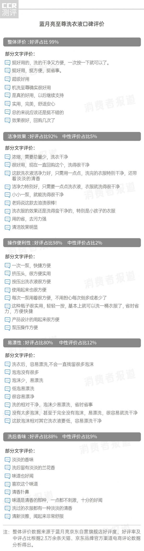经《消费者报道》对京东、天猫品牌官方渠道2.3万余条电商评论数据的分析,结果显示,蓝月亮至尊洗衣液的整体满意度十分高,好评占比达99%,不少用户评论道“效果很好,回购几次了”“ 是真的好用,以后继续支持”等。