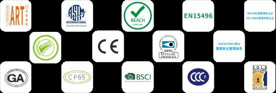 欧美各国家对于品质都有不同的要求标准,琨山的产品陆续通过各项国际产品检测认证(如欧洲CE、ROHS、SKG、REACH、美国ASTM认证等)