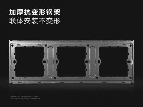 因为要支撑一到五位开关的安装,所以安装内框的支撑结构材料更重要。以雅点联体开关为例,采用的是加厚抗变形钢架,更加稳固安全,联体安全不变形。