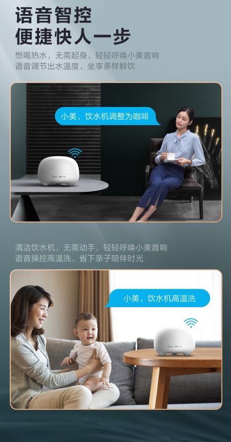 在智能体验上,美的悦家饮水机YR1908S-X能够让你告别繁琐操作---喝热水、调节出水温度,清洁饮水机等通通无需动手,只要轻轻呼唤小美音响,就能轻松实现语音智控,省下亲子陪伴时光,便捷快人一步!