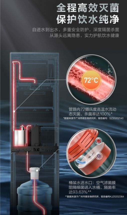 如果你担心喝不完的桶装水会滋生细菌,那么美的悦家饮水机YR1908S-X是你的安心之选,饮水机管路内72摄氏度高温水流动态灭菌,杀菌率高达100%!桶装水进水口还配备了空气滤菌膜,有效拦截空气中的粉尘细菌,阻隔细菌进入水桶,隔菌率达93.63%,严防死守不留菌~