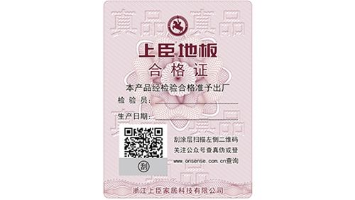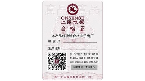 2020年上臣地板启用新版防伪合格证,如图所示。该防伪合格证只需刮开涂层,用手机扫二维码即可查询真伪。