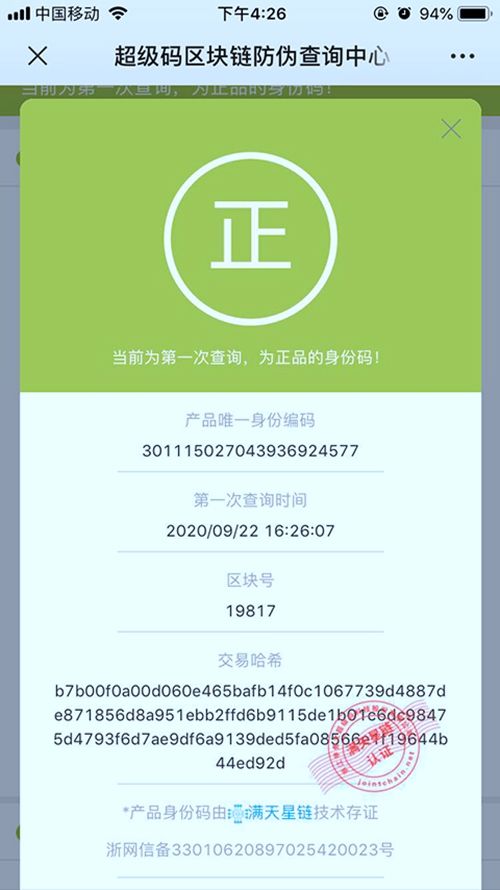 如为首次查询,查询结果带有“正”字标识,表明您购买的是正品。
