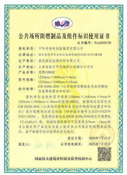 澳思柏恩阻燃OSB板,采用最新磷氮复合环保型阻燃剂(通过SGS有机挥发物权威检测)。成品板材通过国家防火建筑材料质量监督检验中心检测,获得公共场所阻燃制品及组件标识使用证书,符合国标GB 8624-2012标准B1(c-s2,d0,t1)级要求,单体燃烧、可燃性、烟气毒性等级(WX)检测均合格。