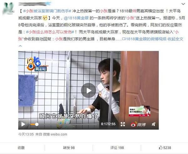 小张这么帅怎么可以受伤?看到这句话是不是一脸懵逼,小张是谁?他受什么伤了?这其实是1818黄金眼新闻里的主人公。报道称,9月8号小张洗完澡后,浴室里的【钢化玻璃】突然自爆,导致他的手被割伤了。而当看完新闻后,网友们的反应居然是:“小张好帅,肯定不是他的错”、“小张这么帅怎么可以受伤”、“物业快跟小张道歉”。