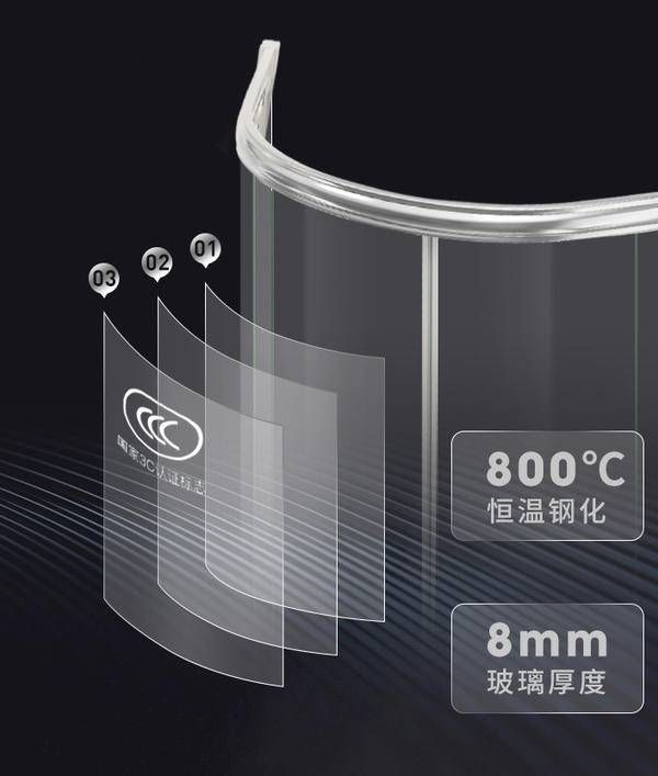 卡贝对安全问题从不敢大意,淋浴房采用了通过了国家3C认证的汽车级钢化玻璃,由3层高温真空夹胶玻璃组成。玻璃在800℃的恒温下进行钢化处理,厚度达到了8mm,安全性能非常出色。