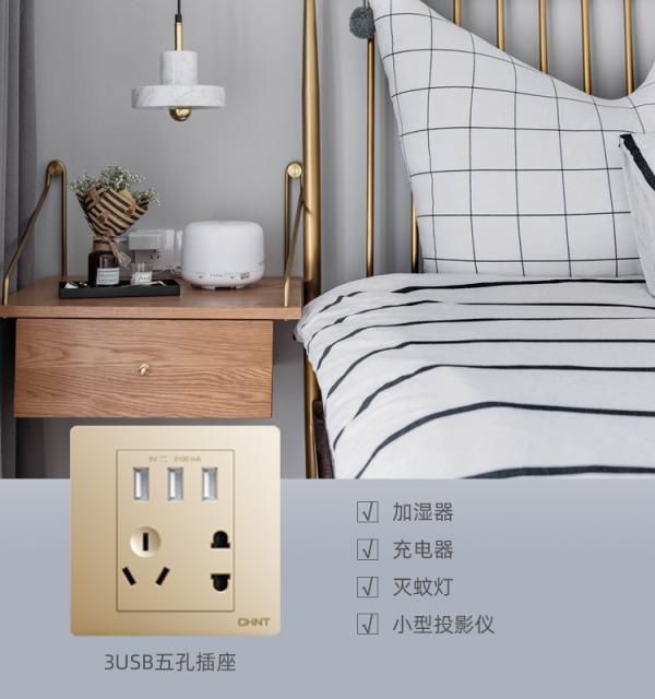 小加湿器、灭蚊灯、香薰机、除螨仪、小型投影仪、手机充电器等是卧室床头可能要使用的,因此床头也要预留两孔和三孔插座。卧室会使用的小家电虽然多,但很多不会同时使用,而且有的小家电也会做成USB的接口,所以在床头位置可以安装正泰开关带USB五孔插座,一个插座解决床头用电问题。另外,在卧室也可以预留小夜灯的插座。
