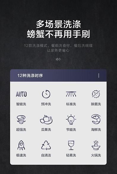 一个好的洗碗机,不仅能解决餐后清洁,餐前食材清洗,也能轻松解决。美的集成式水槽洗碗机悦净XQ02设计了12款洗涤模式,多场景洗涤满足用户对餐前餐后清洁的需求。其中针对餐后碗碟清洁,根据不同的餐具类型,设计了超强洗、轻柔洗两种功能程序,像材质较硬的锅具可以开启超强洗程序 ; 像玻璃材质的高脚杯等可以开启轻柔洗程序,专业洗护,保护餐具不受磨损。