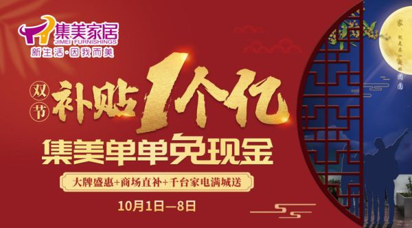 红旗迎风招展,金秋十月歌如潮。情浓中秋、欢度国庆,2020年最后一个法定假日即将来临,双节同庆正是消费者装饰爱家的好时节。作为皇城根下老字号,集美家居一直以爱家为品牌理念,致力于为广大消费者提供美好新生活。值此家国同庆的日子,在10月1日至8日,集美家居诚意钜献,特别奉上“双节补贴1个亿 集美单单免现金”的爱家大礼,向消费者宣告:错过集美家居之前促销活动的可借此机会再为爱家“添新衣”。