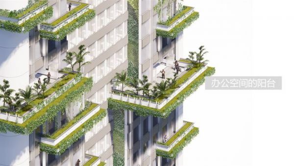 室内外绿化:工作环境及其周边的绿化,显著改善室内外的微气候,有利于员工和访客的身体健康。种类各异的绿色植物,可种植于阳台、空中花园、窗户、墙壁以及室内各处,有助于维持环境的生态平衡。