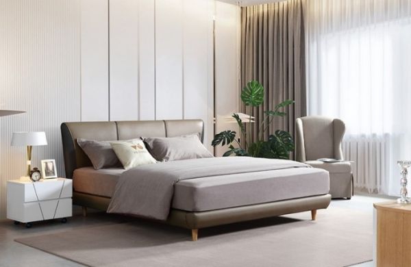 该款床使用自然原木稳固支撑,打造密实木床脚,承托力十足,坚实耐用、防虫防潮。其靠包部分精选亚光细纹头层黄牛皮,弹性好、工艺可塑,光润质感和细腻美观的纹理,柔软亲肤透气;非接触部分采用仿生科技布,柔软亲肤,耐污耐刮,还容易清洁。在色系上,以驼色为主,金色调为辅的中性搭配,优雅的色系显得温暖大气,极简百搭,可随心搭配各种家居。