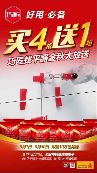 留缝找平更便捷。巧匠找平器,好用必备,实实在在的好帮手!本月超值回馈,金秋好福利,买4箱送1箱,限量10万包,速速来竞抢~