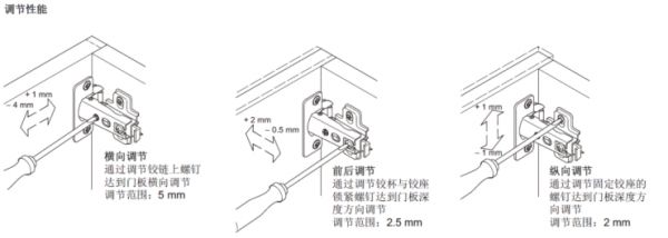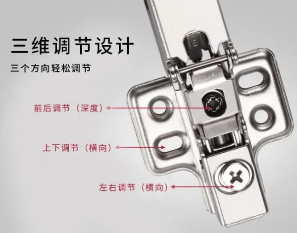 三维可调节设计,易调节,免重装。可使用调节螺丝可以对柜门侧边、高度和深度三个方向进行调节,解决门歪、缝隙大等尴尬情况。