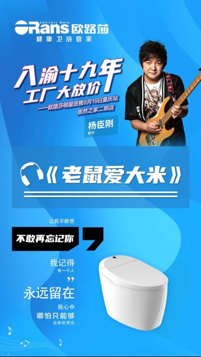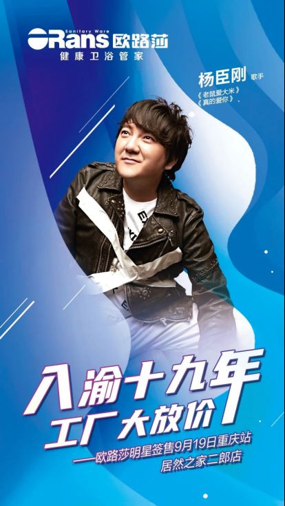 9月19日,欧路莎携手“第一代超人气网红歌手”杨臣刚空降重庆,持续推进全国明星签售活动,以创新营销模式抢占用户、抓取流量,再次吹响卫浴行业销售战争的冲锋号角,一场卫浴界的“星”动狂欢即将开启。