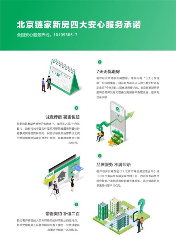 在交易保障方面,北京链家新房在去年11月推出了七天无忧退房、诚意荐房买贵包赔、品质服务不满即赔、带看爽约补偿二百在内的“四大安心服务承诺”,涵盖新房交易过程中的多发纠纷问题。而本次北京链家新房在“全民新房节”中推出的优惠楼盘项目,也全部在“四大安心服务承诺”范围内,让购房者能够更放心、更安心的参与活动和完成交易。
