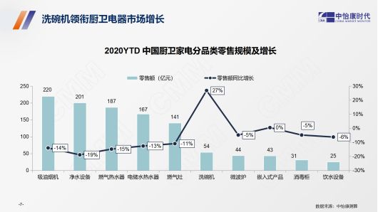 从经济和市场环境来看,2020年上半年我们GDP同比下降了1.3%,随之看到市场销售大幅的下降接近12%,新冠疫情对零售业,乃至消费者信心都有着严重的打击。中怡康厨电总经理施婷谈到,从前8个月来看,厨卫行业下降了15%,但从细分市场数据看到,洗碗机产线一枝独秀,今年到目前为止它的增长速度是在27%。所以我们从中看到,消费者对于洗碗机的接受程度在攀升。而且性价比成了竞争的利器,产品性能的不断升级,给高端产品带来了生机。