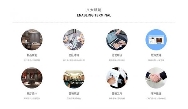 2020年,嘉柏仕整合旗下饰面板、地板、墙板、五金、定制家居等优质品牌资源,进军国内大家居市场,创新8大赋能增值服务体系:新品研发、展厅设计、团队培训、营销策划、运营帮扶、营销工具、软件支持、客户推送等,助力区域定制家居工厂发展,让定制工厂产品更时尚、更好卖、更赚钱!得到客户广泛认可,市场地位得以巩固。