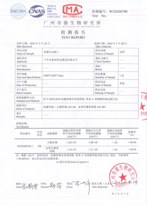 千年舟光触媒抗菌生态板二氧化钛能够快速的发生催化反应,减少细菌在抑制或分解前就转移的风险。抗菌性能优,可有效抑制、分解金黄色葡萄球菌,大肠杆菌、铜绿假单胞菌、肺炎克雷伯菌,抗菌率可达99.99%。