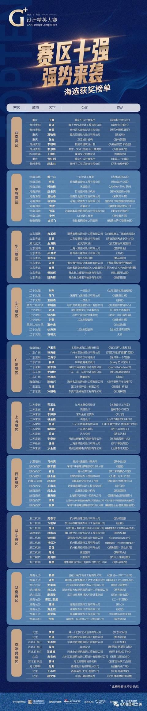 此次海选,是在来自全国数千份设计师作品中,按十大赛区来划分遴选,每个赛区产生TOP10名单,全国则诞生大赛百强名单。我们一睹为快,看看这份新鲜出炉的百强名单中是否有你的名字。